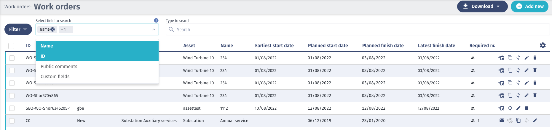 Search for any field or information on the work order search bar. The search field enables the user to search for specific work order names, ID, public comments, and custom fields.