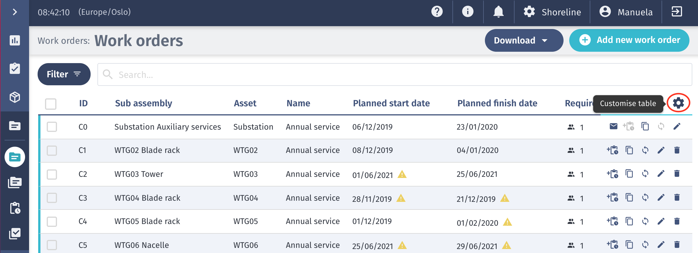 Activate 'Filter' in the work order list. Select the relevant information. Filter based on the different work order fields.